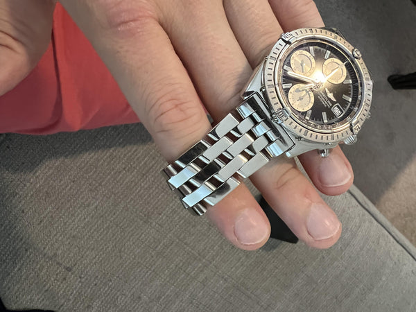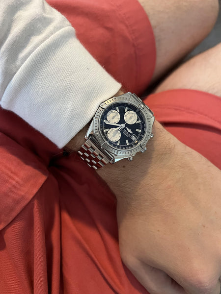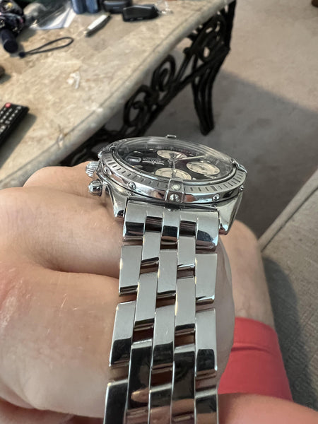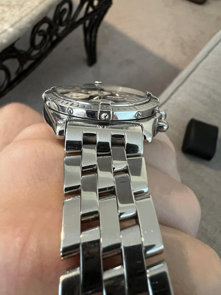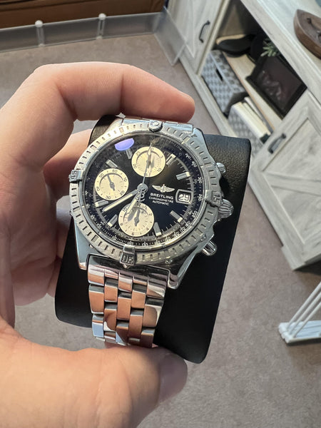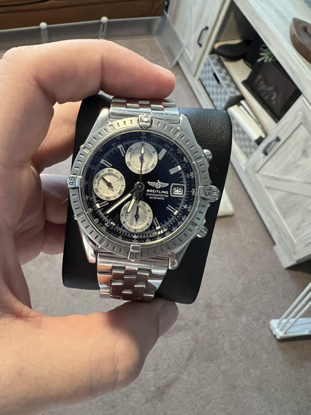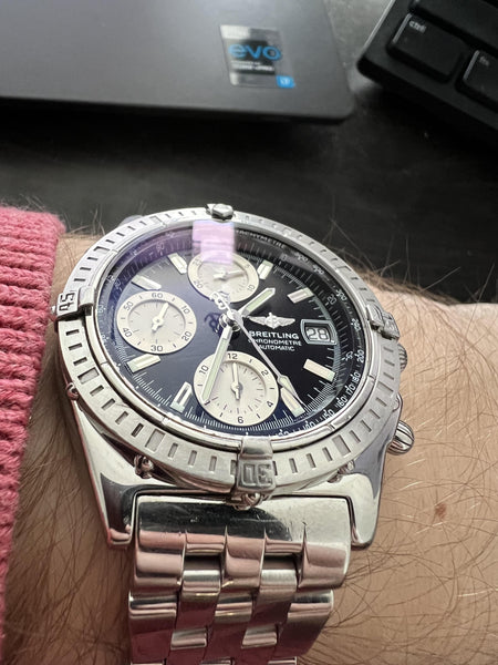 This Breitling Chronomat A13352 is in excellent pre-owned condition, showing minimal signs of wear. The movement has been recently serviced, ensuring precise timekeeping and reliability. A perfect addition for collectors or enthusiasts who value performance and style.