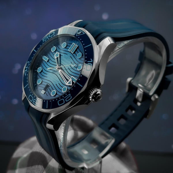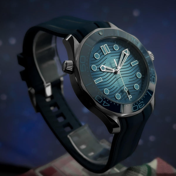 • Polished blue ceramic [ZrO2] dial with laser-engraved wave pattern