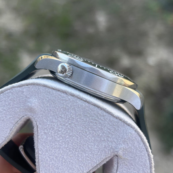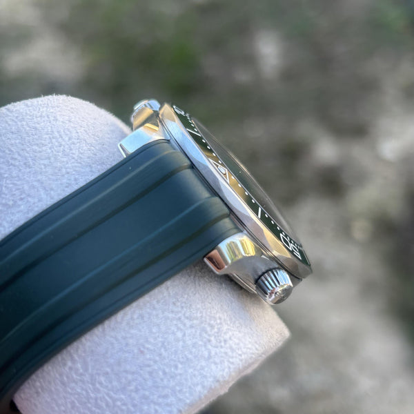 • Green ceramic unidirectional rotating bezel with white enamel diving scale for enhanced durability and style