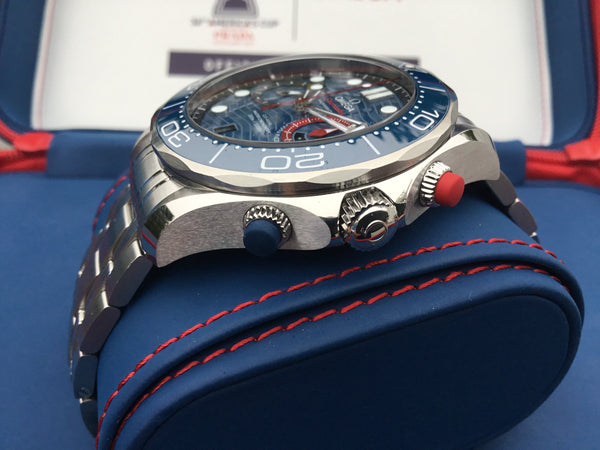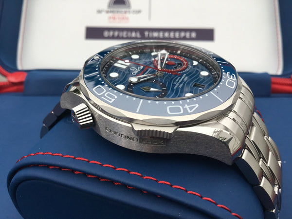 A bold and distinctive timepiece, the Omega Seamaster Diver 300M Master Co-Axial 44 Chronograph America embodies the heritage and innovation of Omega’s iconic Seamaster line. Perfectly blending style, functionality, and precision, this limited-edition chronograph celebrates the adventurous spirit of Omega enthusiasts.