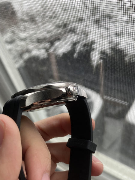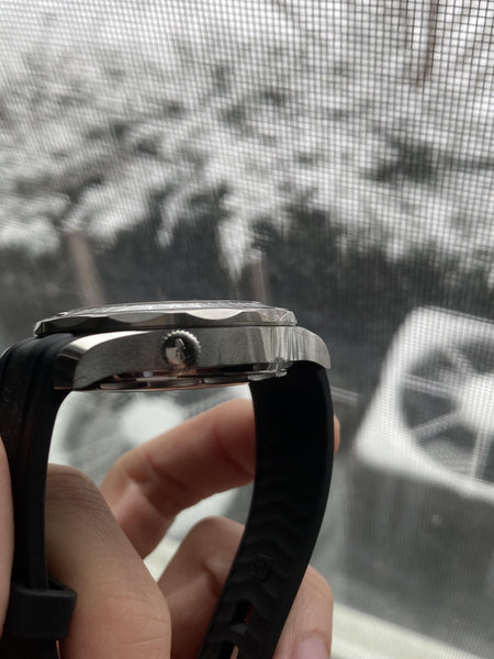 • Black rubber strap with a stainless steel pin buckle for a sporty and comfortable fit