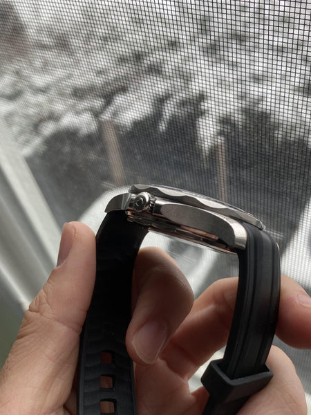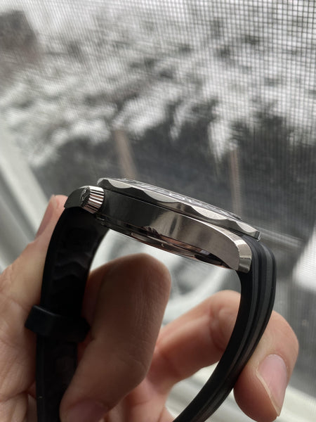 • Unidirectional rotating ceramic bezel with a black diving scale filled with white enamel for durability