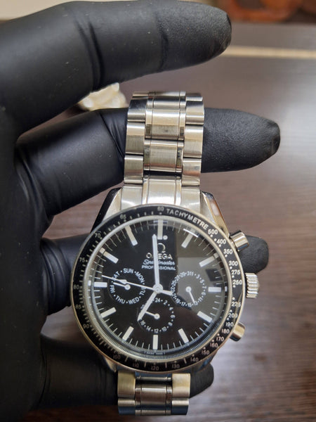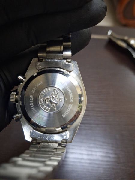 Up for sale is a special edition Omega Speedmaster honoring the legendary Formula 1 driver Michael Schumacher. This unique timepiece is part of Omega's celebrated collaboration with the racing icon, blending the Speedmaster’s timeless design with vibrant, motorsport-inspired details.