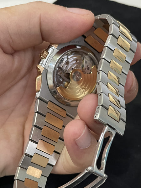 For sale is the luxurious and sporty Patek Philippe Nautilus Two-Tone Chronograph, reference 5980/1AR. Combining stainless steel and rose gold, this timepiece is a bold statement of sophistication and modern design, offering the versatility of a sports watch with the elegance of precious materials.
