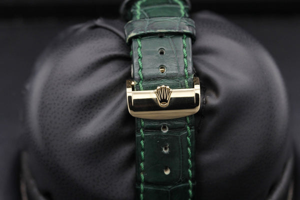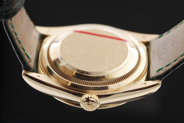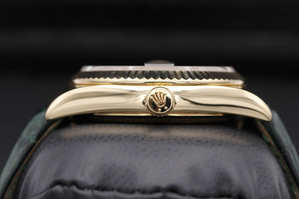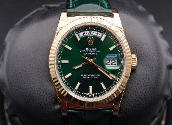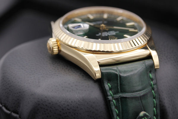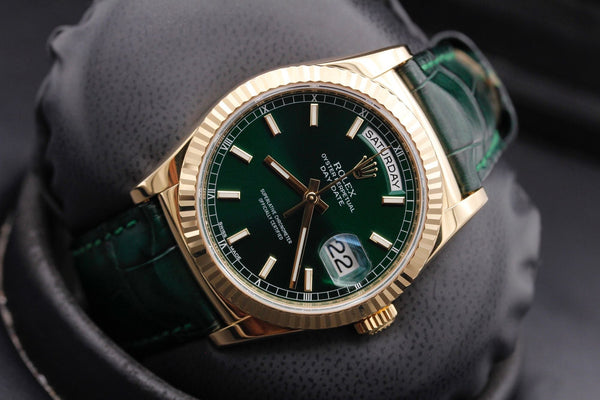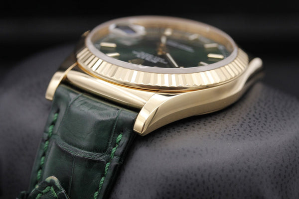 The Rolex Day-Date 36, Reference 118138, is a striking and sophisticated timepiece, featuring a vibrant green dial paired with luxurious yellow gold. Finished with an elegant alligator leather strap, this watch is a bold expression of refined style.